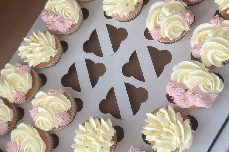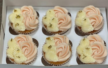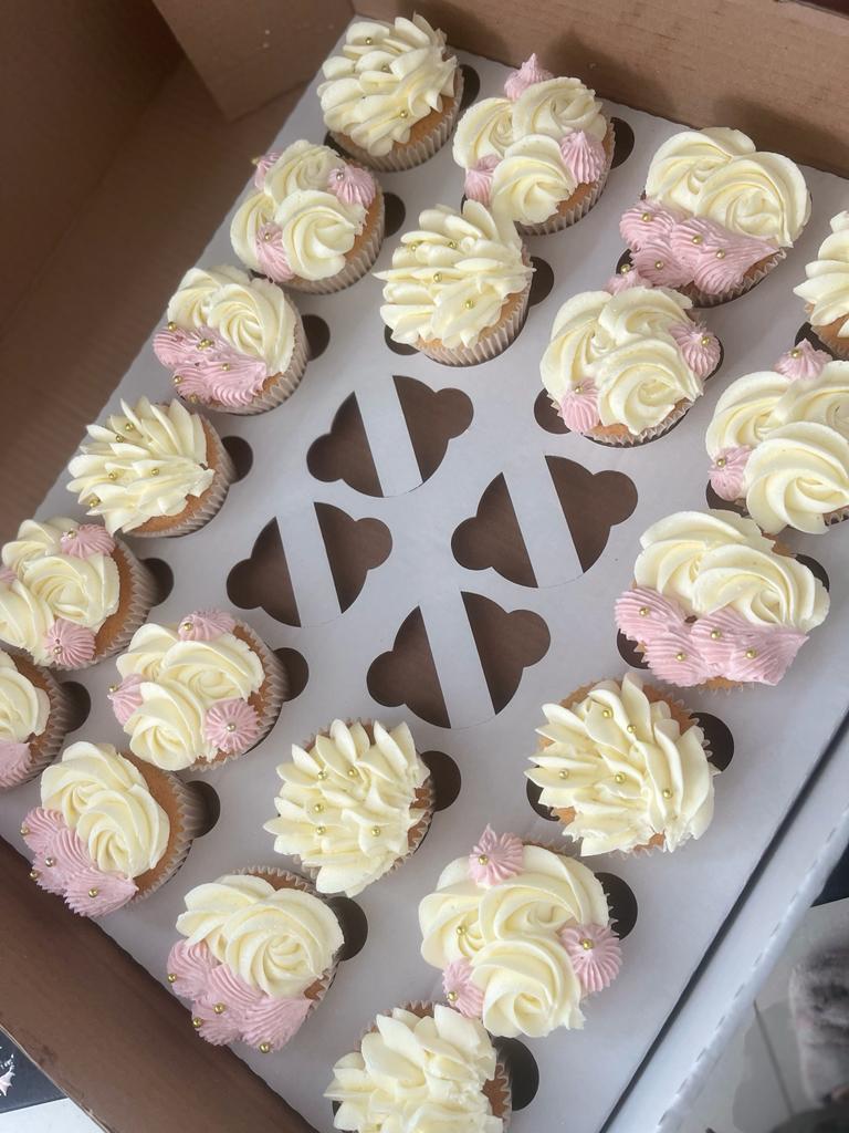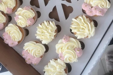 Indulge in our Petal Cupcake Box, featuring 24 delectable vanilla cupcakes swirled with creamy buttercream frosting and adorned with a beautiful floral design in shades of pink and cream. Each bite is a perfect balance of moist cake and buttery frosting, making it an ideal treat for any occasion. Share with friends and family or keep them all to yourself, either way, our Blossom Box is a delightful and charming addition to any celebration.