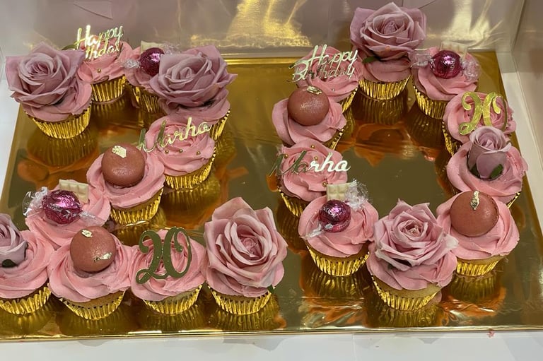 Celebrate any milestone with our "Twenty Bloom box" Cupcake Box. These 20 delicious vanilla cupcakes are expertly piped with our signature pink buttercream in a beautiful rose design, arranged to form the number 20. The cupcakes are topped with an assortment of delicate macaroons and decadent Lindor chocolates for an extra touch of elegance. Perfect for birthdays, anniversaries, or any special occasion.