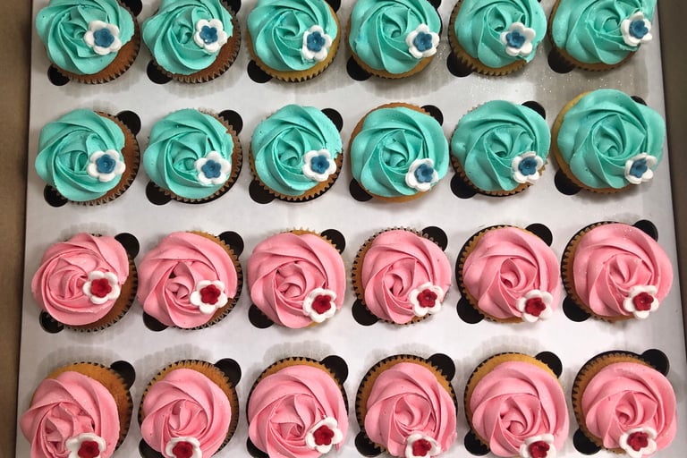 The cupcakes in this box are a playful combination of pink and turquoise with a delicate fondant rose on each one, and the rose swirls made of buttercream add a deliciously decadent touch. This box is perfect for any occasion, from birthdays to baby showers to just because. Treat yourself and your loved ones to the perfect balance of color and sweetness with our Half and Half Rose Swirl Cupcake Box!